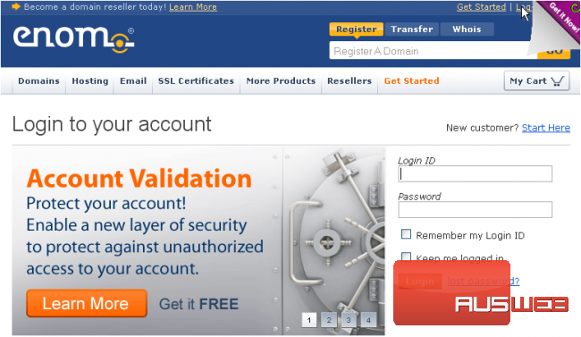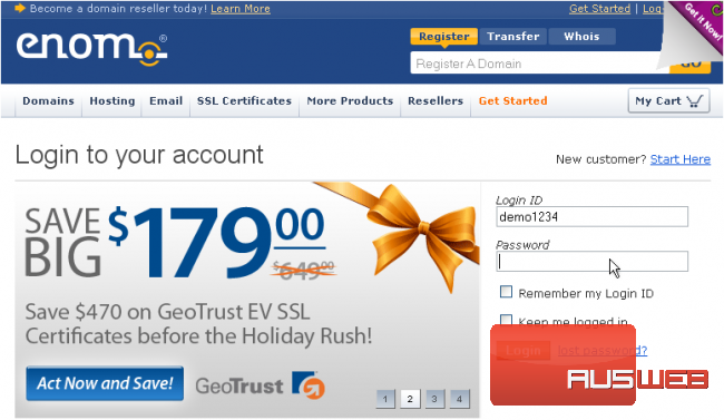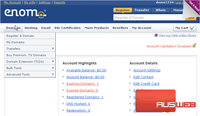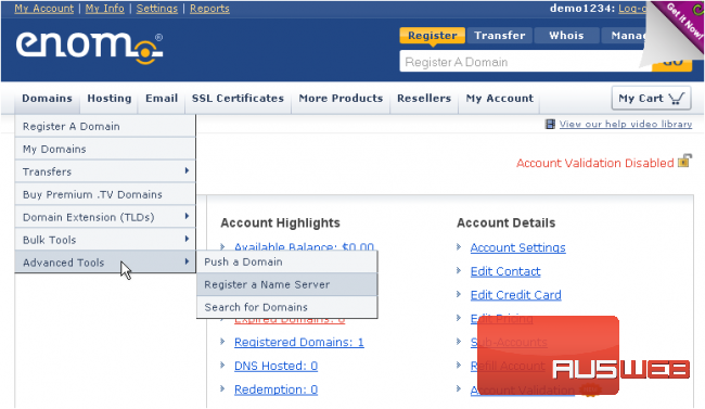 This demo assumes you have a domain name registered through enom.com, and starts from their home page