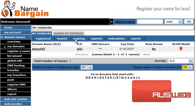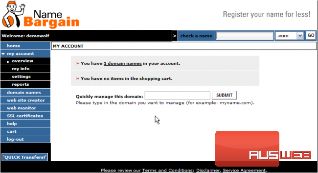 This demo assumes you have a domain name registered through NameBargain.com, and starts from their home page