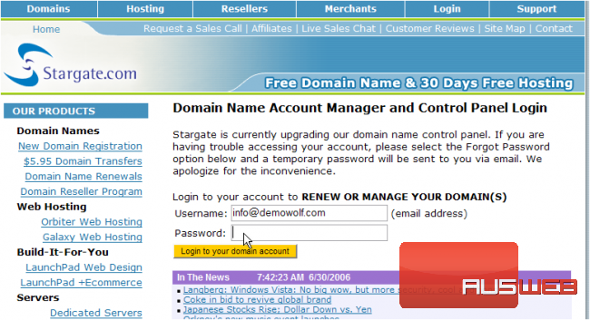 This demo assumes you have a domain name registered through StarGate.com, and starts from their home page