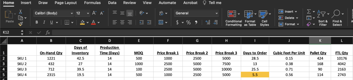 If you’re doing any assembly or kitting you also need to make sure you’re accounting for everything you need to ship out our product, which could include packaging, product inserts, etc. Standard shipping boxes from suppliers such as Uline are usually very quick to order, but if you have any custom packaging, mailers, etc. be sure to run a days of inventory calculation for these components as well.