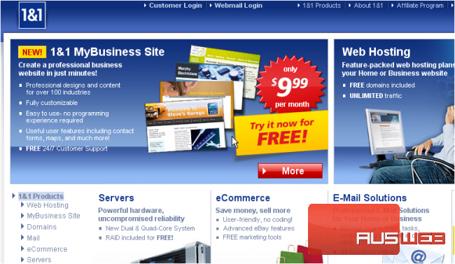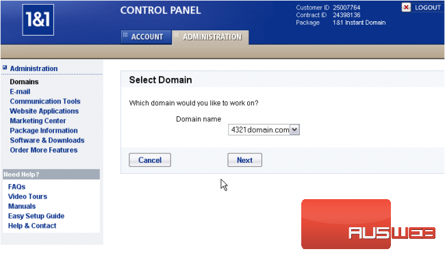 This demo assumes you have a domain name registered through 1and1.com, and starts from their home page