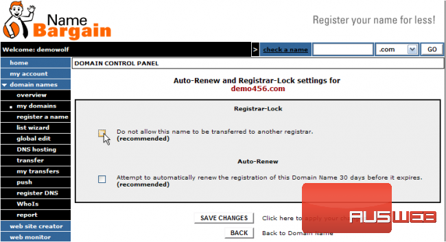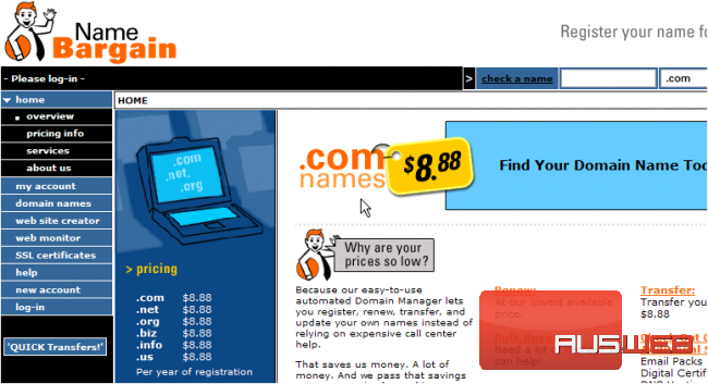 This demo assumes you have a domain name registered through NameBargain.com, and starts from their home page