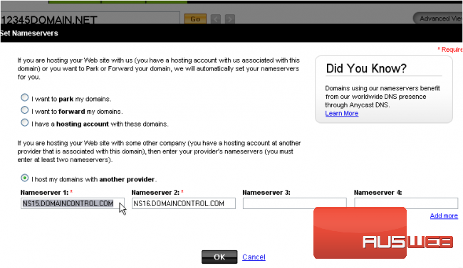 6) Now enter the correct DNS settings in the boxes provided here, so that your domain name will point to your new web hosting account